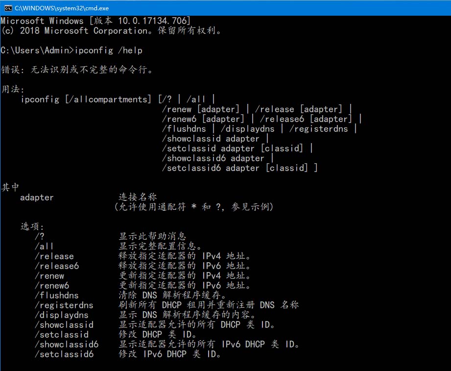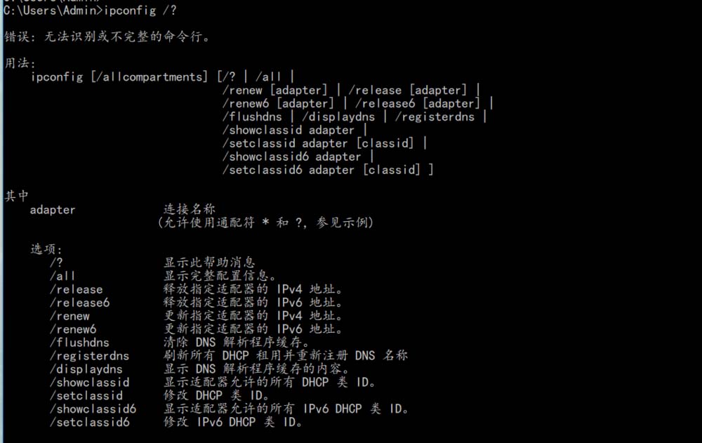 3、也可以使用ipconfig /?命令来查看帮助信息。
