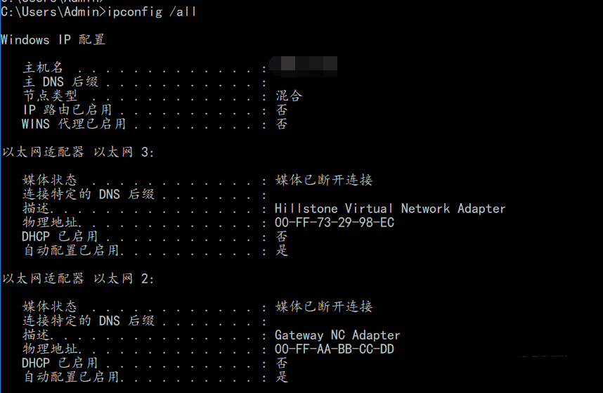 6、ipconfig/all显示的 网卡详细的信息,包括未激活的网卡链接信息。