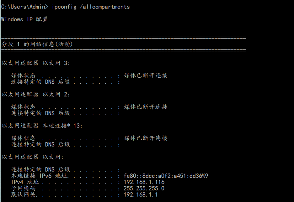 7、此外其实可以使用ipconfig /allcompartments 可以查看活跃的网卡信息,并且标注不活跃的网卡。