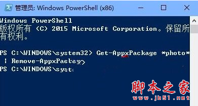 2、在管理员:Windows PowerShell窗口,输入Get-AppxPackage *photo* | Remove-AppxPackage后回车。