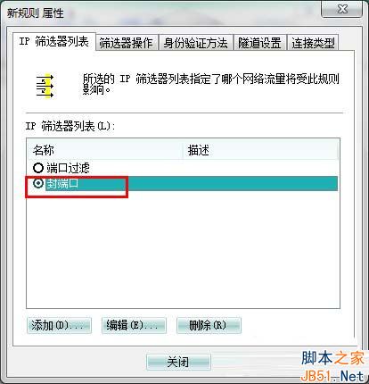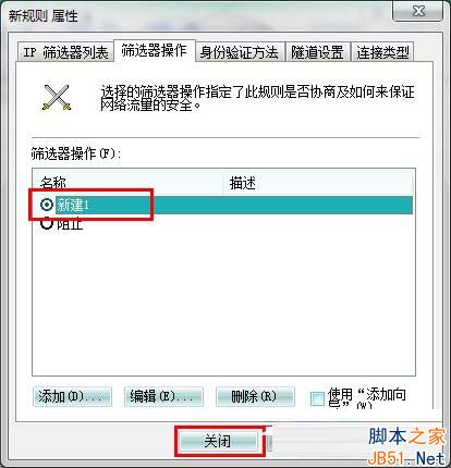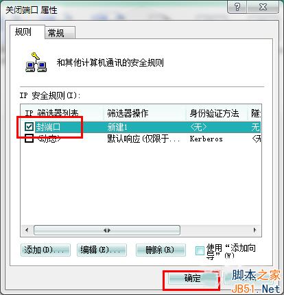 10、选中刚才新建的“新建1”,单击关闭,返回到“关闭端口 属性“对话框,确认“IP安全规则”中 封端口 规则被选中后,单击 确定