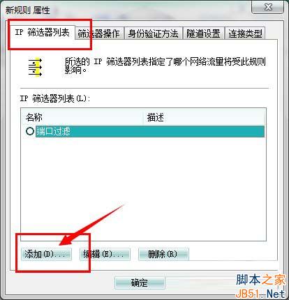4、在弹出的“新规则 属性”对话框中,选择“IP筛选器列表”选项卡,单击左下角的“添加”