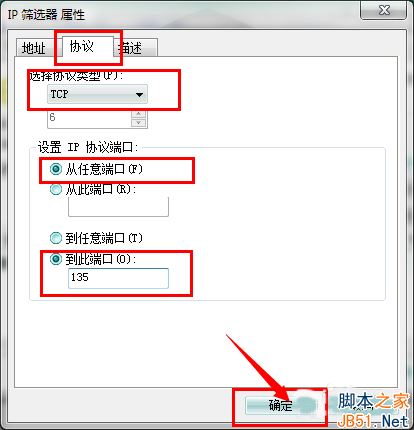6、在出现的“IP筛选器 属性”对话框中,选择“地址”选项卡,“源地址”选择“任何”,“目标地址”选择“我的IP地址”; 选择“协议”选项卡,各项设置如图片中所示。设置好后点击“确定”。