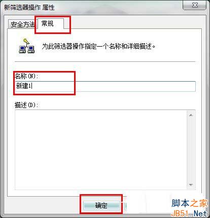 9、在“筛选器操作 属性”中,选择“安全方法”选项卡,选择“阻止”选项;在“常规”选项卡中,对该操作命名,点确定