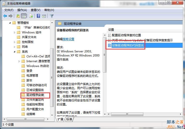2、在组策略编辑器中依次打开用户配置→管理模版→系统→驱动程序安装,在右侧找到“设备驱动程序的代码签名”,双击打开其设置。
