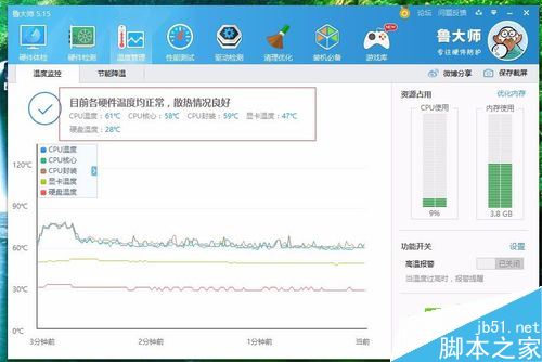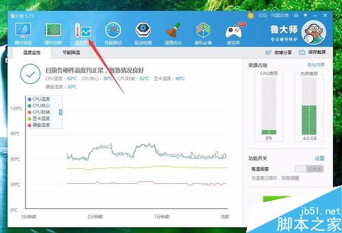 在我用红色框圈起来的部分,就可以看到cpu的温度,核心的温度,以及显卡和硬盘的温度。