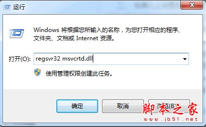 2、点击“开始——运行”,输入“regsvr32 msvcrtd.dll”命令,点击“确定”,就会出现已加载msvcrtd.dll的提示。