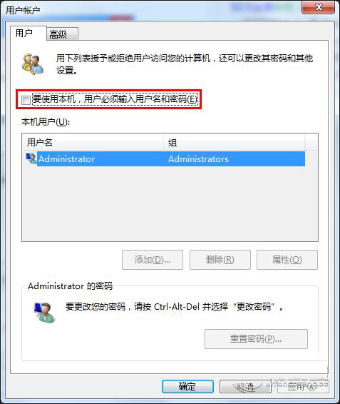 3、在随后打开的用户帐户属性设置窗口中,将“要使用本机,用户必须输入用户名和密码”前的勾选去掉,然后点击“确定”按钮即可,如下图所示: