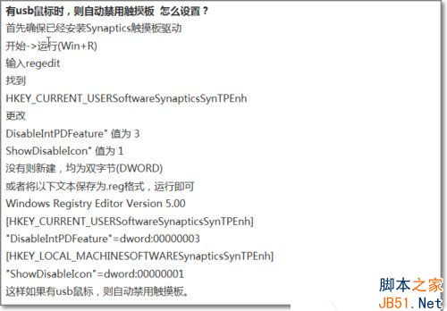 8、若想达到当有usb鼠标插入时,则系统会自动禁用触控板可以参与下图进行设置,涉及修改注册表,未测试过。有兴趣的朋友可试试。
