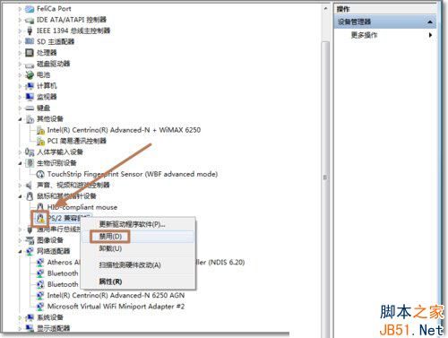 2、我的电脑-右键选中“管理”进入“设备管理器”找到鼠标,如图可以看到两个设备,一个是USB鼠标,另一个是PS/2,Win7系统识别笔记本的触控板。