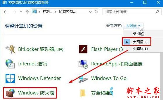 2、将控制面板“查看方式”修改为“大图标”,在下面点击“Windwos 防火墙”;