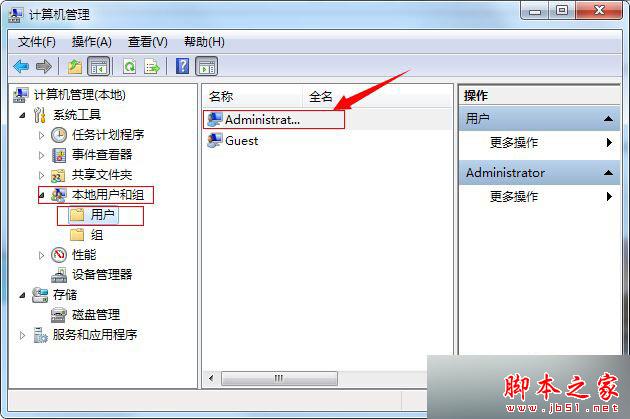 3、选中【用户】选项,双击右侧列表中的【administrator】用户,这时我发现该帐户为禁用状态,我们把【帐户已禁用】前面的勾 取消,然后确定。