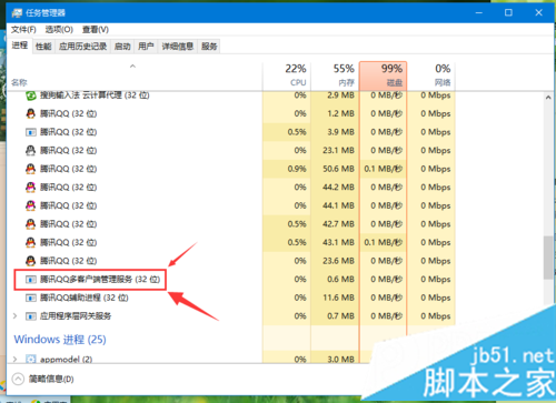 2、然后,登录第11个时会遇到被限制登录,此时操作键盘,同时按下Ctrl+Alt+Del 调出任务管理器,点击进程,找到腾讯qq多客户端管理服务的程序,点击结束程序。