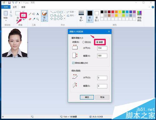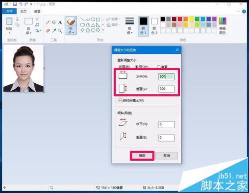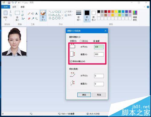 把像素调整为:308,为保证照片不变形,默认保持纵横比(M),再点击:确定;