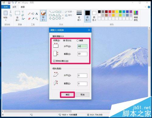 我们掌握了更改照片的百分比值扩大照片的方法,则更改图片的百分比值缩小图片也就很容易了。导入图片以后,在【重新调整大小】 - 百分比项,更改百分比数值为60,为保证图片不变形,默认保持纵横比(M),再点击确定;