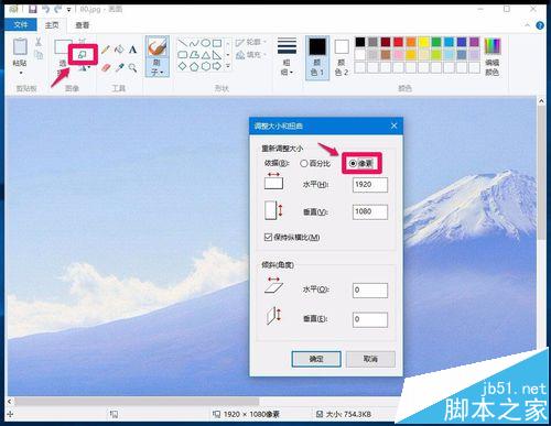 我们导入照片后,点击【工具栏】-【图像】- 【重新调整大小】图标,在【重新调整大小】项点击:像素;