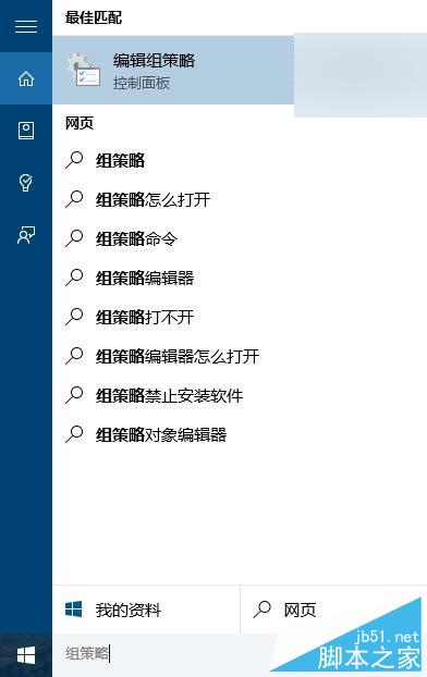 1、在Cortana搜索栏输入“组策略”后,点击第一个“最佳匹配”结果(或在运行中输入gpedit.msc后回车),如下如——