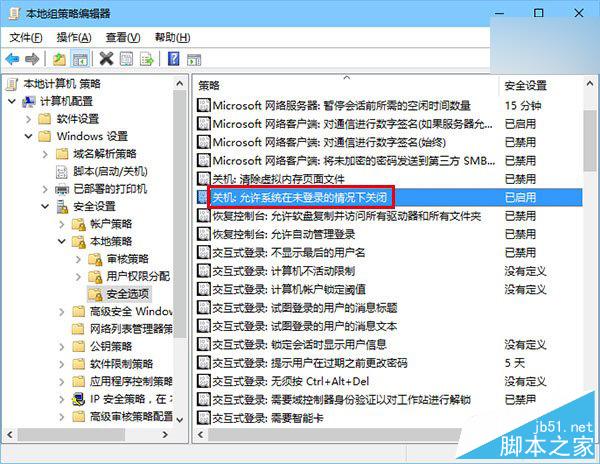 2、在左侧目录找到计算机配置→Windows设置→安全设置→本地策略→安全选项,然后在右侧项目中找到“关机:允许系统在未登录的情况下关闭”,如下图——