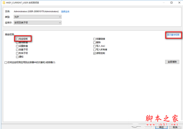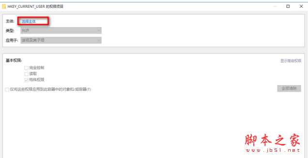 HKEY_CURRENT_USER的权限项目窗口,在这个窗口中,基本权限项都呈灰色状态不可选择,我们点击:选择主体;
