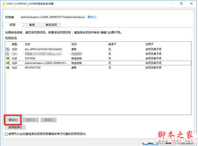 3、 在打开的HKEY_CURRENT_USER的高级安全设置窗口,点击:添加;