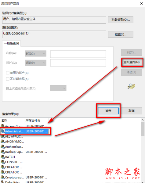 6、按下来,我们在对话框中点击:立即查找(N);在搜索结果(U)栏中用鼠标按住右侧的小滑块向下拖动,找到本机登录的用户名如:GONG ZOU,并左键单击用户名,再点击:确定;