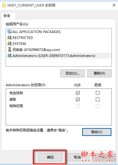 10、回到HKEY_CURRENT_USER的权限窗口,点击:确定,退出注册表编辑器。