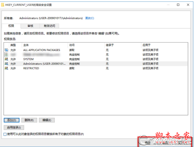 9、回到HKEY_CURRENT_USER的高级安全设置窗口,点击:应用 - 确定;
