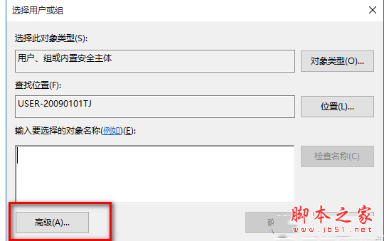 5、在打开的选择用户和组对话框中,点击:高级;