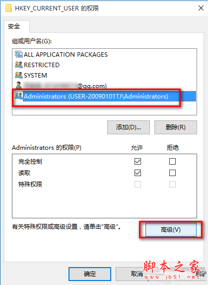2、此时,打开了HKEY_CURRENT_USER的权限对话框,在这个对话框中,我们先查看本机登录的用户名,如组或用户名(G)栏中没有,点击:高级选项;