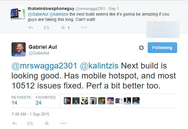 8月13日凌晨, 微软已经正式向用户开始推送win10 Mobile预览版10512更新了,这个版本的更新新增了一系列的新功能,不过就目前来说Win10 Mobile手机版10512中存在一些已知问题,而现在距离上次Win10 Mobile预览版10512系统更新推送已经过去20天,Windows Phone网友又开始期盼下一个Win10手机版。每天都会有网友在Twitter询问Windows Insider项目负责人Gabriel Aul,但大多被回应“No Builds”。