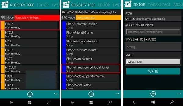 2、展开HKEY_LOCAL_MACHINE (HKLM)\System\Platform\DeviceTargetingInfo,将PhoneModelName与PhoneManufacturerModelName更改为RM-938;