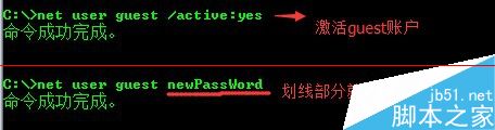 6、输入 net user guest /active:yes 激活guest账户,改密码的话就是net user guest 新密码