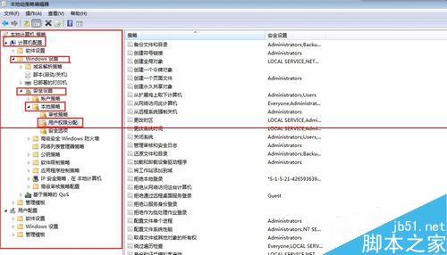 8、依次打开“计算机配置-windows设置-安全设置-本地策略-用户权限分配”把窗体打开到如下图所示状态