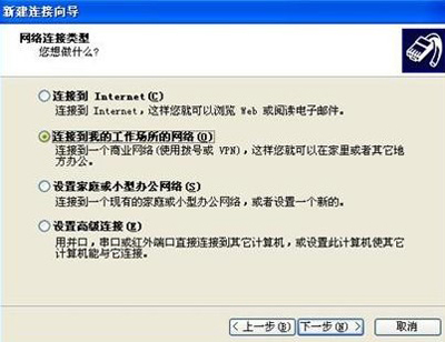 单击“下一步”,选择连接类型为“连接到我的工作场所的网络”;
