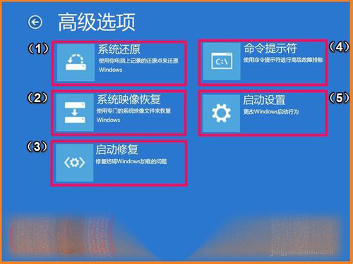 如果我们在系统中设置了还原点,可以选择(1)系统还原来还原Windows;如果没有设置还原点,用系统映像文件(光盘或U盘)安装系统,可以选择(2)系统映像恢复;如果是系统加载出现了问题,可以选择(3)启动修复-修复妨碍Windows加载问题;如果我们要使用命令提示符进行高级故障排除,可以选择(4)命令提示符;如果需要进入安全模式,选择(5)启动设置;