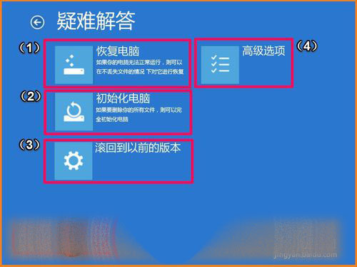 如果我们的电脑无法正常运行,在不丢失文件的情况下,恢复电脑的系统,可以选择(1)恢复电脑;如果要删除电脑的所有文件,可以选择(2)初始化电脑;如果我们要恢复以前版本的系统,可以选择(3)滚回到以前的版本;如果我们需要进入安全模式,可以选择(4)高级选项;