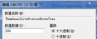 4、双击打开这个新建的ThumbnailLivePreviewHoverTime键值,在数值数据处录入200,表示为2秒的意思,再点击确定按钮保存后退出注册表编辑器。