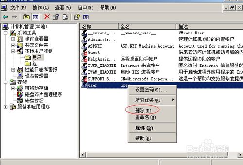 二、右键我的电脑--管理--本地用户和组--右键登录用户--删除。删除用户可能导致原有软件因权限不够而用不了,这样你可以建立管理员用户。这样就不会出权限不足而使用不了。