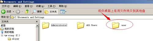 一、首先我们要知道这是用户配置文件出现损坏,所以我们要保存好原用户桌面上的文件,拷贝到其他盘,以免操作失误导致覆盖原文件夹,从而使文件丢失。路径C:\Documents and Settings\user