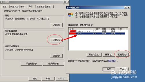 三、还有种方法就是右键我的电脑--属性--高级--用户配置文件--将用户复制到你原来文件夹中去。但是这种方法存在一定风险,因为会覆盖掉原来文件夹,导致文件丢失。而且这种方法还存在一个比较大问题是,你覆盖掉文件,但是注册表依然存在引用问题,还会出错。这个我尝试过,不能解决问题。