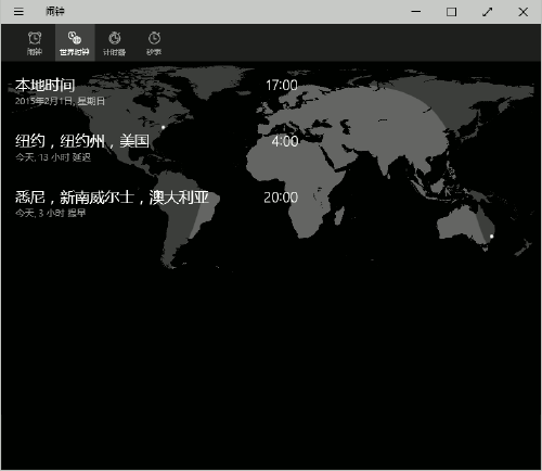Windows 从 8 开始有了闹钟应用,在 10 build 9926 中成为 Modern APP(现代应用),在桌面上也能用了。在提供闹钟功能的同时,还有世界时间、计时器、秒表等功能。