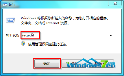 2.在“运行”程序窗口,输入“regedit”,并点击“确定”,如图2所示: