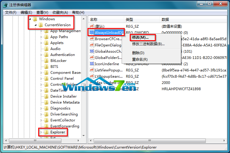 3.在“注册表编辑器”窗口中,依次找到HKEY_LOCAL_MACHINE\SOFTWARE\Microsoft\Windows\CurrentVersion\explorer,鼠标左键点击“explorer”,在右侧窗口,找到“AlwaysUnloadDll”,如图3所示: