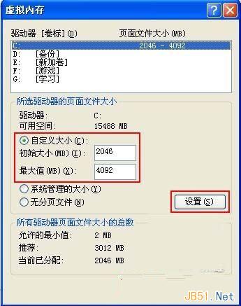 提示:设置虚拟内存根据实际情况而定,硬盘空间大可以设置大点