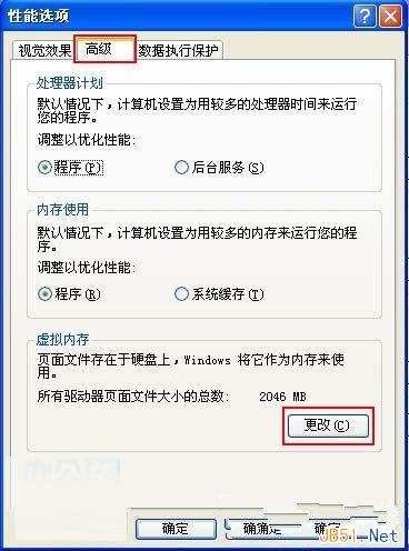 3、 在“性能选项”中再次选择“高级”,然后在“虚拟内存”栏目下单击“更改”。