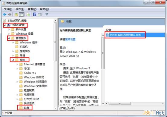 2.打开本地组策略编辑器,从左边栏目依次进入“计算机配置” — “管理模块” — “系统” — “恢复”,双击右边栏目的“允许将系统还原到默认状态”