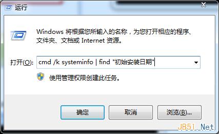 首先通过win7的快速组合键“win+r”打开运行窗口,然后在运行窗口中输入:cmd /k systeminfo | find "初始安装日期"(记住这里的双引号必须在英文状态中输入);如下图所示: