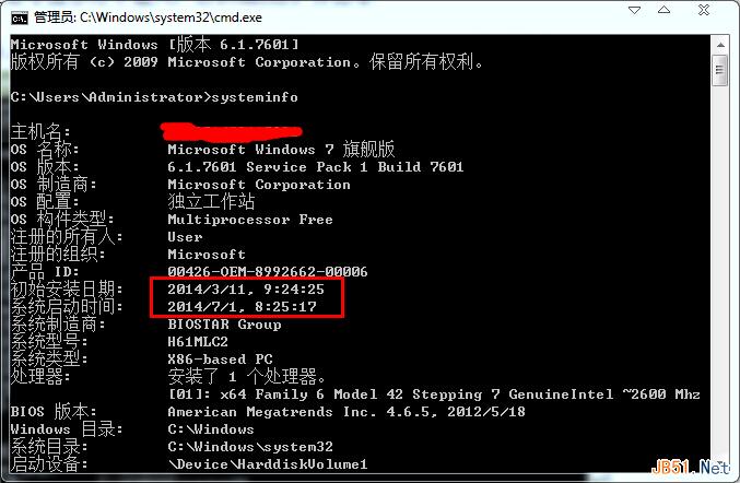 当按下回车键后就会弹出初始安装时间,小编的win7系统测试初始安装时间结果为2014年3月11日