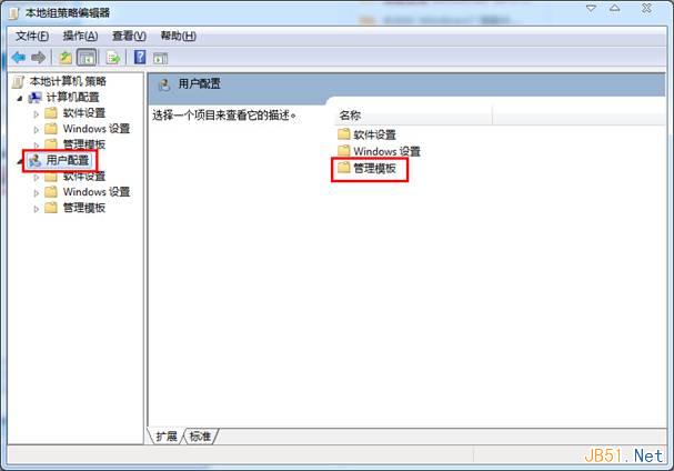 2. 打开本地组策略编辑器后,在左边列表中鼠标单击“用户配置”,然后双击右边栏目的“管理模板”;如下图所示: