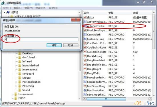 2.寻找[HKEY_CURRENT_USER\ControlPanel\Desktop],在右边的窗口中选择AutoEndTasks,如下图所